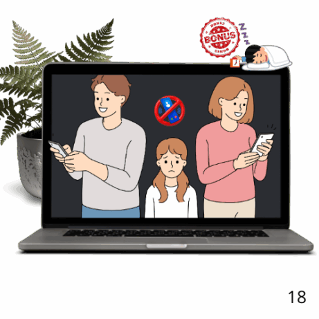 Získate praktický digitálny kontrakt, ktorý pomáha nastaviť pravidlá používania obrazoviek v celej rodine. Súčasťou sú aj vzory dialógov s partnerom či starými rodičmi, aby všetci v rodine rozumeli nastaveným pravidlám a vzájomne ich dodržiavali.